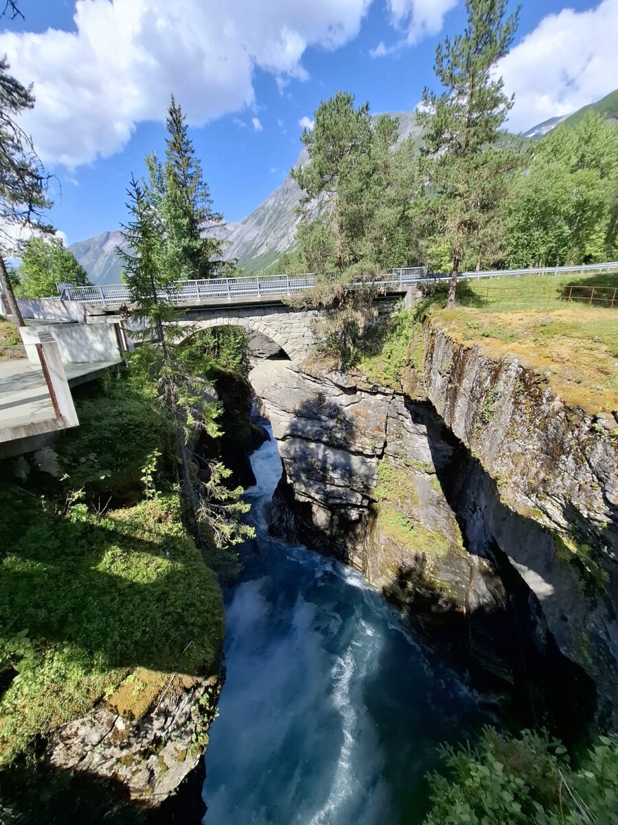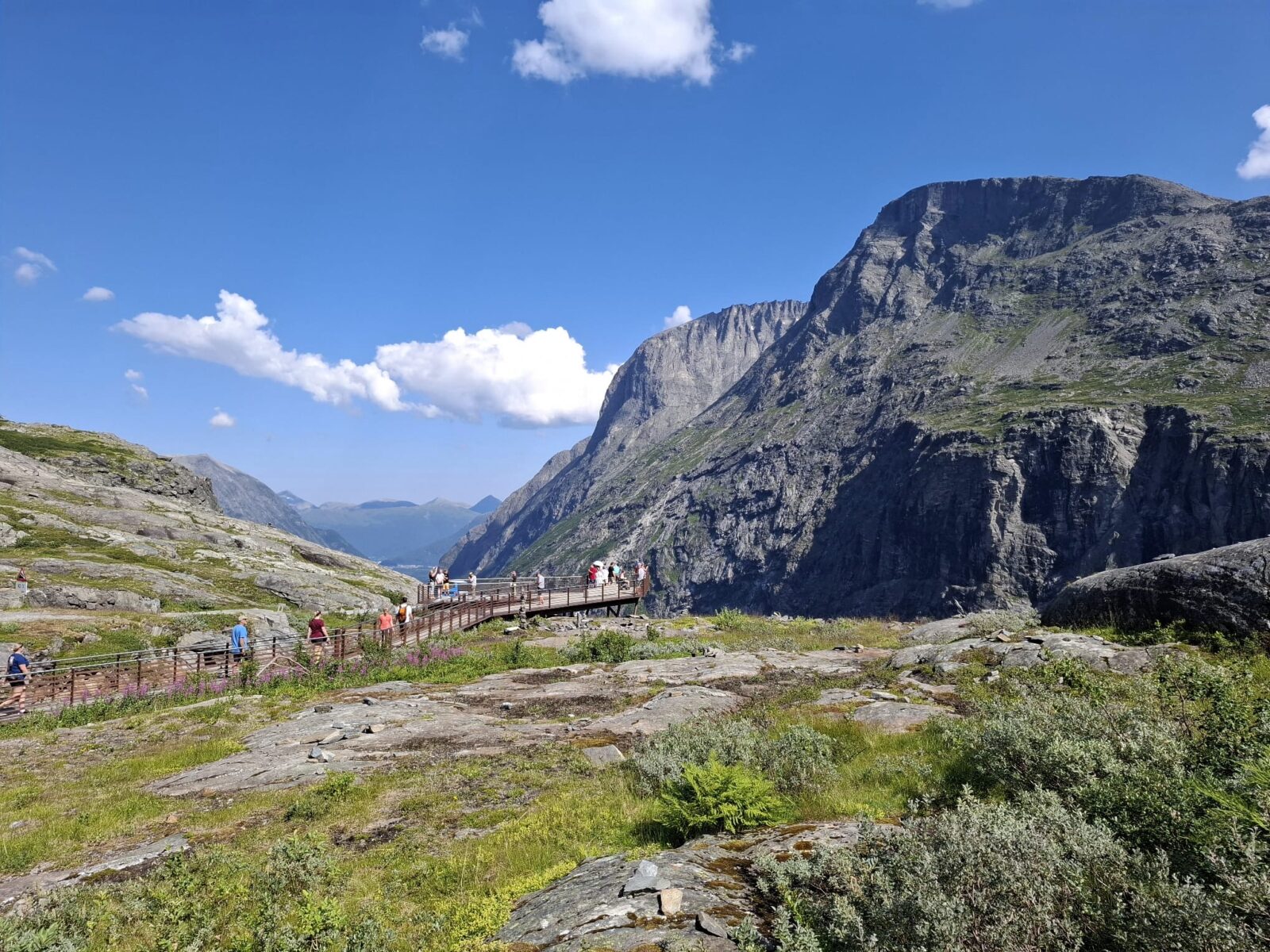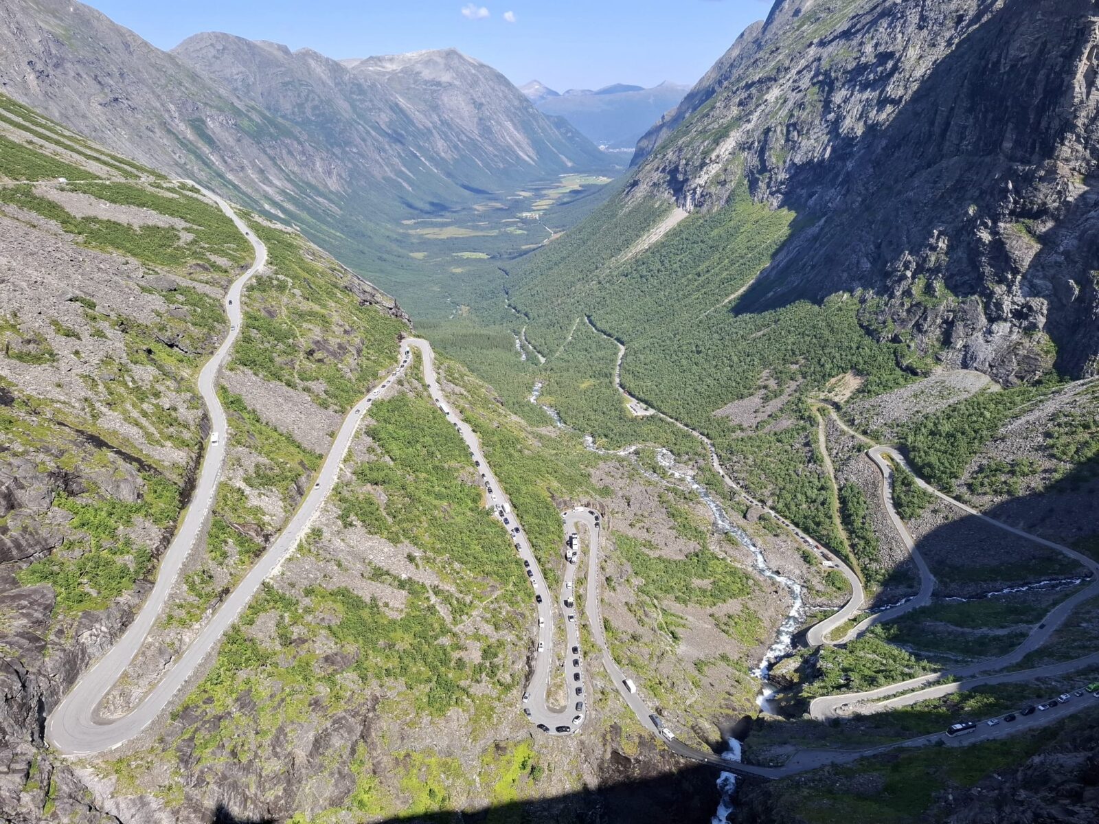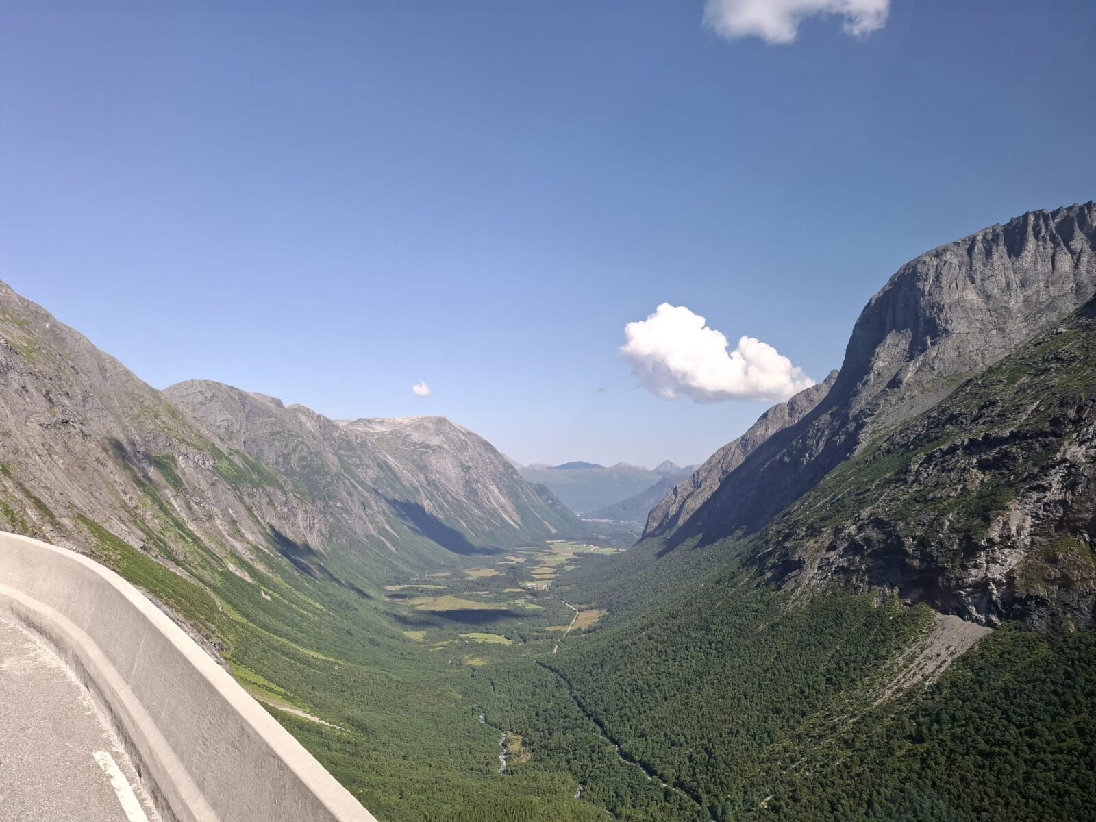 Pojedeme hlubokým a úzkým údolím Romsdalen vytvořeným řekou Rauma. Cesta vede úzkou soutěskou s kolmými skalními stěnami. Údolí je dlouhé přes 60 km a okolní stěny dosahují výšku téměř 2000 m.
