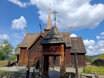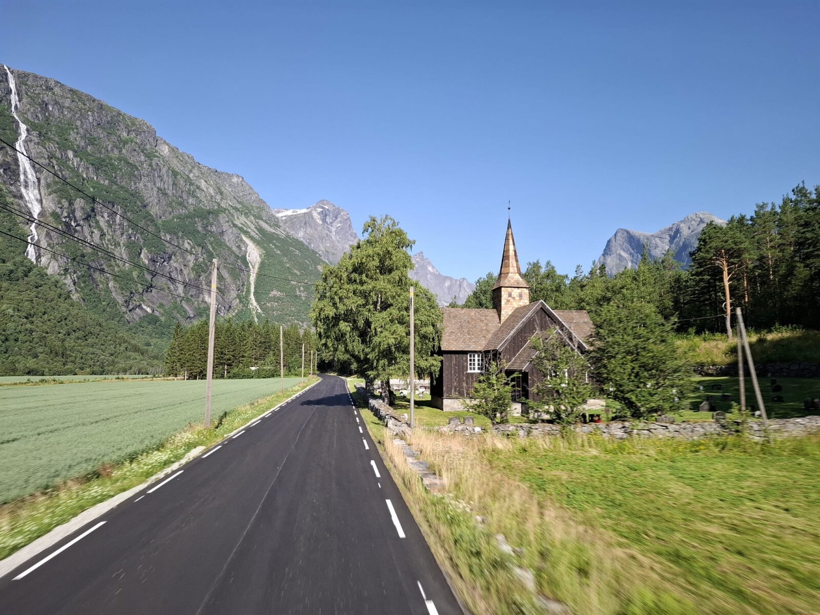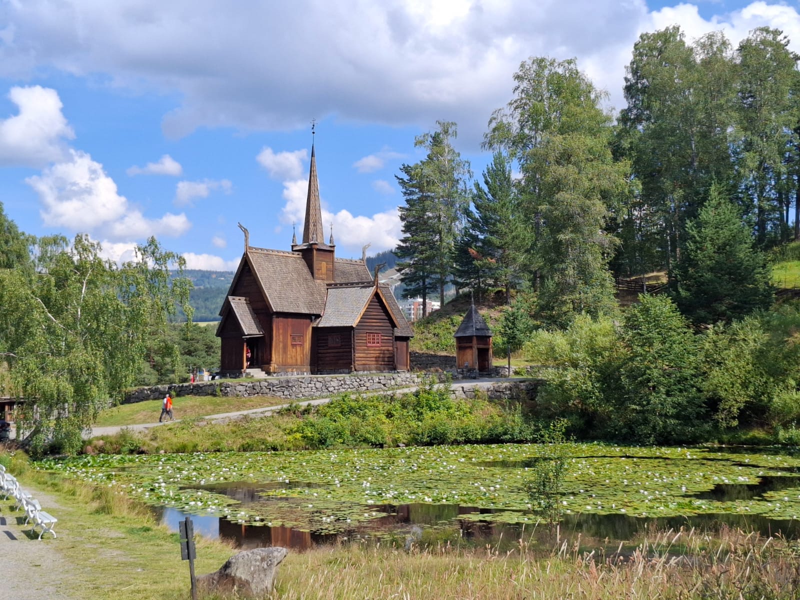 Zastávka u zajímavého, starobylého venkovského roubeného kostela Ringebu Stavkirke.