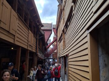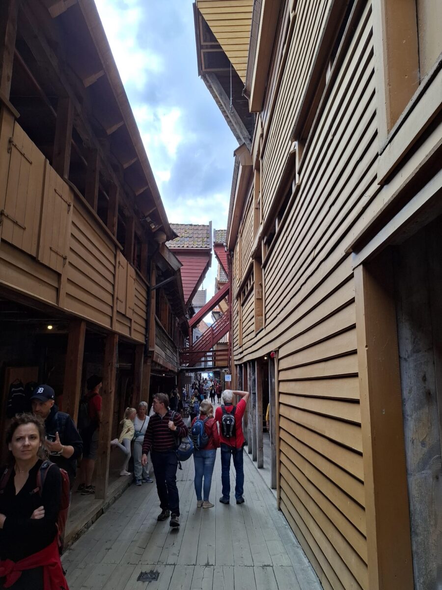 Bergen, dopolední prohlídka: přístav s dřevěnými hanzovními domy a hradem, středověkými kostely, ale i moderní koncertní Grieghalle. Dopoledne je v přístavu tradiční rybí trh. Lze navštívit třeba akvárium nebo museum lepry, která ve 14.stol byla pohromou pro Norsko. Na vyhlídku Ulriken (643m) lze vyjet lanovkou. Odpoledne přes Eidfjord, zastávka u vodopádů Voringfossen (182m) na kterými se klene vyxhlídková visutá lávka.. Přejezd drsnou, pustou náhorní planinou Hardagenvidda. Nocleh